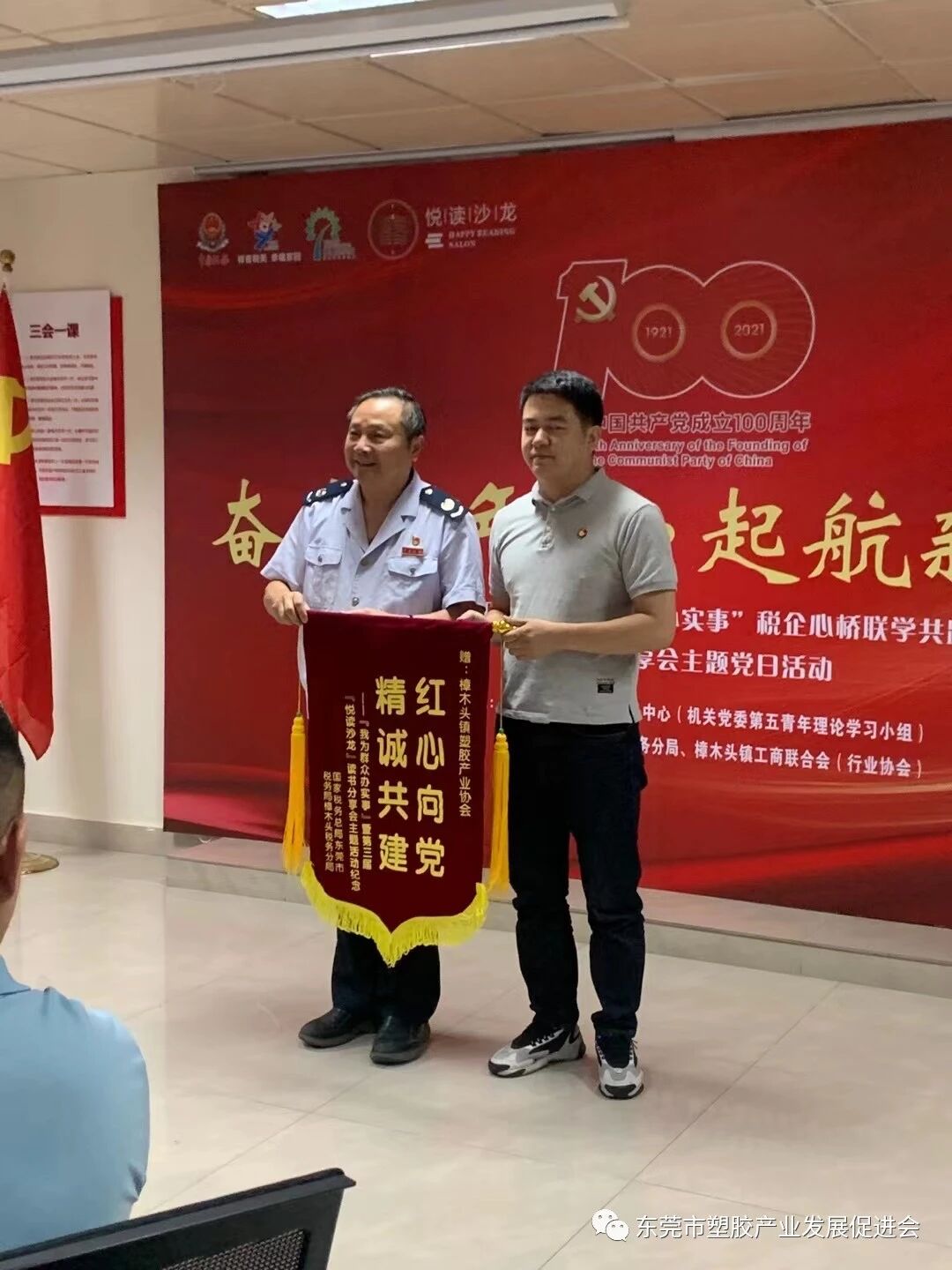 2021年是中国共产党成立100周年,是开启建设社会主义现代化国家新征程的第一年,也是“十四五”规划的开局之年。7月28日下午,在市税务局纳税服务中心的指导下,由纳税服务中心(第五青年理论学习小组)、征收管理科、樟木头税务分局、东莞市塑胶产业发展促进会等行业协会共同联合搭建“税企心桥”联学共践平台开展“我为群众办实事”活动暨青年读书分享会(悦读沙龙)主题党日活动在樟木头税务分局成功举办!