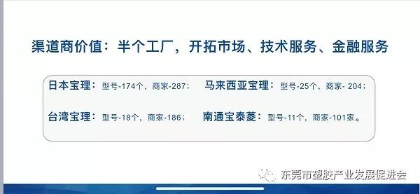 宝理 POM一直是华南市场重要的流通品牌,目前四个化工厂流通的型号有228个。 销售商家日本宝理POM有287家,马来西亚宝理有204家,台湾宝理有186家,南通宝泰菱有101家,他们实质的角色虽然是贸易商,起的是半个工厂的作用:一方面开拓市场,进行技术服务,另一方面进行金融服务。